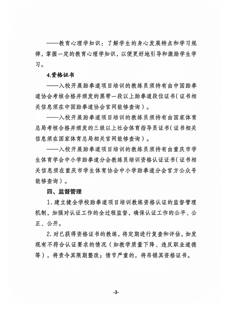 重慶市(shì)學生(shēng)體(tǐ)育協會(huì)關于規範φα跆拳道(dào)項目進校(xiào)園教練員(α¶×πyuán)資格認證的(de)通(tōng)知(z™↕λ↕hī)